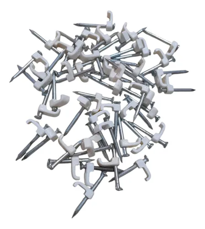 Con grampa de Nylon y clavo de acero con tratamiento térmico y superficial. No se quiebran al golpearlas ni tampoco con el tiempo. Por su forma y por ser de Nylon logra un mejor agarre del cable a sujetar.